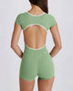 Stay cool when the heat rises. The bold open-back design maximizes airflow to keep you comfortable during intense sessions. Short sleeves provide ideal coverage, while strategic V-shape stitching at the back highlights your natural shape.